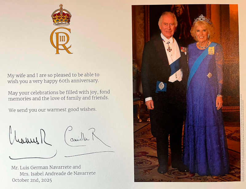 Su Alteza, el Rey de Inglaterra Carlos III y la Reina Consorte del Reino Unido y de los catorce reinos que forman la Mancomunidad de Naciones, Su Majestad Camilla Rosemary Shand, felicitaron a la pareja de esposos colombianos Isabel Andrade Beltrán, Diseñadora de Modas y Germán Navarrete, Periodista, por haber cumplido 60 años de matrimonio, el 2 de Octubre de 2025.