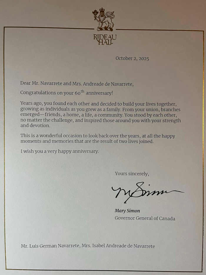 Por su parte, el entonces Gobernador General de Canadá y representante de la Reina Isabel de Inglaterra en 2015, David Lloyd Johnston, felicitó a los esposos Navarrete Andrade por sus 50 años de matrimonio, con el siguiente mensaje personal: