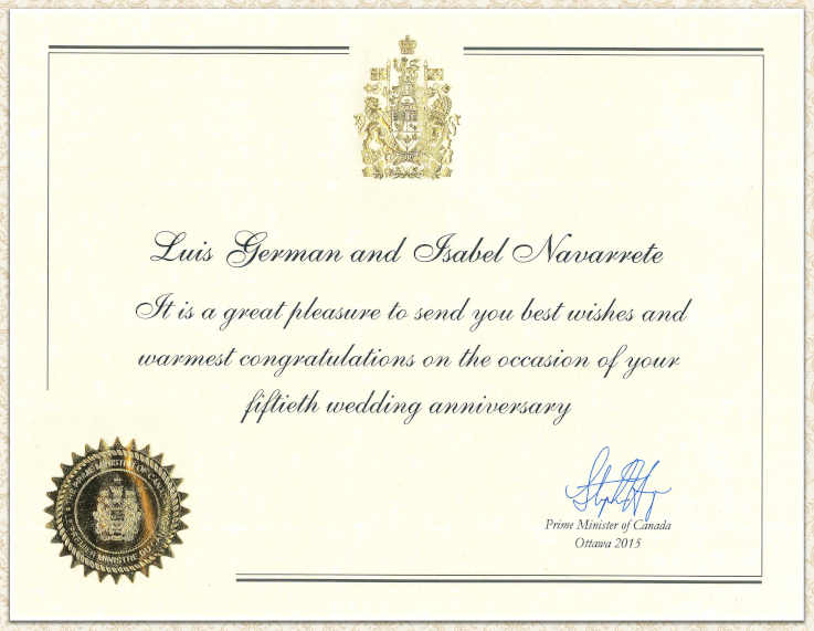 Diez años antes, en 2015, cuando la pareja colombiana celebró sus Bodas de Oro, el Primer Ministro de Canadá, Stephen Joseph Harper, líder del Partido Conservador de ese país y actual Presidente de la Unión Internacional Demócrata, envió una felicitación personal a Isabel y Germán, que dice: