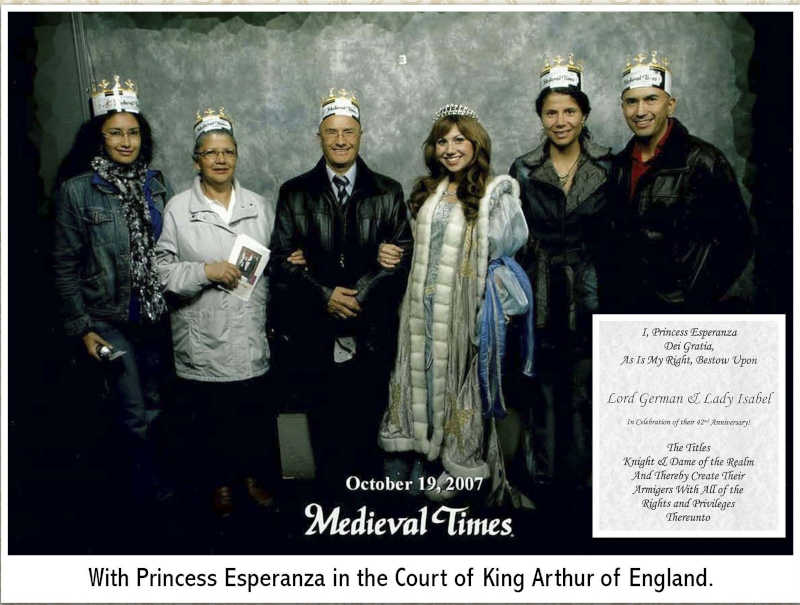 En la gráfica superior aparecen, de izquierda a derecha, María Isabel Navarrete Andrade, Isabel Andrade Beltrán, Germán Navarrete, la Princesa Esperanza, Andrea del Pilar Álvarez Higuera y Germán Darío Navarrete Andrade. En la siguiente gráfica la Princesa Esperanza coloca la espada del Rey Arturo sobre el hombro de Germán, al concederle el título de “Caballero del Reino”.