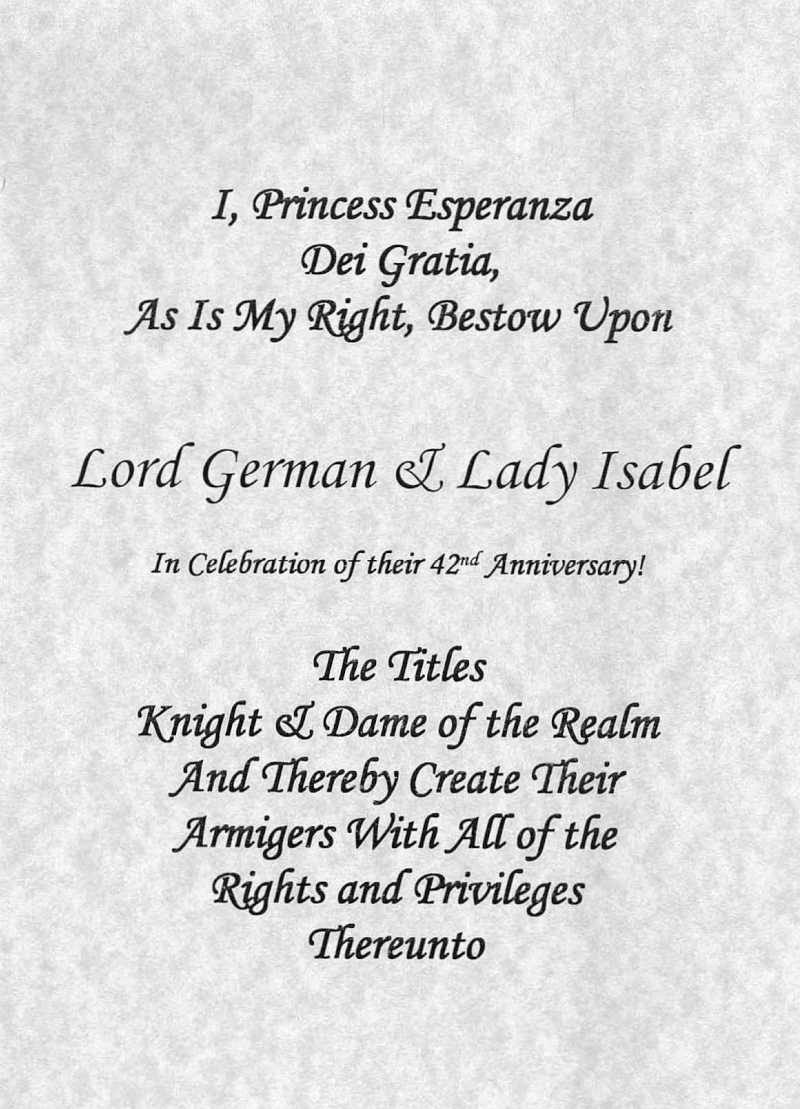 “Yo, la Princesa Esperanza por la gracia de Dios, como es mi derecho, otorgo a Lord Germán y Lady Isabel ¡ En celebración de su 42º aniversario ¡ los títulos de Caballero y Dama del Reino. Y por lo tanto los nombro ArmÍgeros con todos los Derechos y privilegios que ello conlleva”.