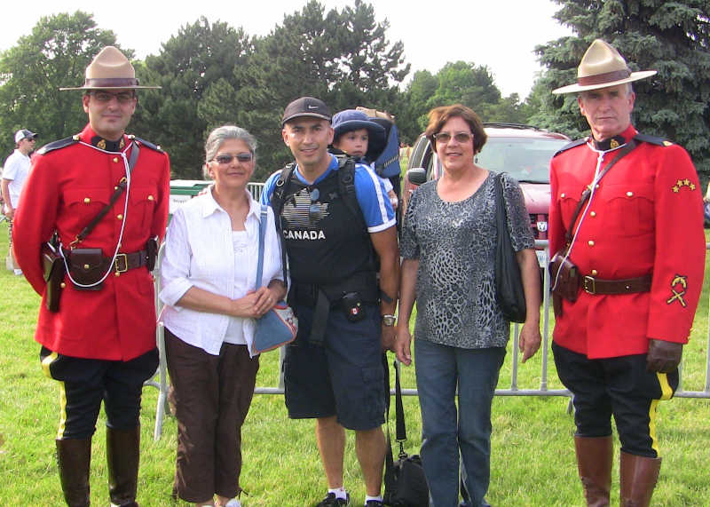 El primero de Julio de 2011, cuando se celebró el Día de la Autonomía de Canadá del Reino Unido –evento que se produjo en 1867–, la familia aparece en compañía de dos Oficiales de la Guardia Montada de Canadá, durante un acto realizado en uno de los parques de la Provincia de Ontario. De izquierda a derecha aparecen Isabel Andrade Beltrán, Germán Darío Navarrete Andrade con su hijo Mateo y Élida Higuera Angarita. (Foto de Germán Navarrete, Centro de Documentación Navarrete).