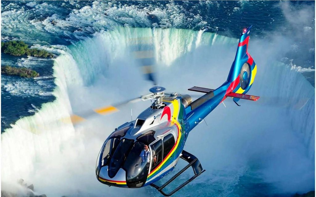 Durante el día es fascinante recorrer la zona en helicóptero porque se aprecia en toda su dimensión la majestuosidad de las Cataratas y se ven los buques con turistas, que navegan en las turbulentas aguas del río Niágara.