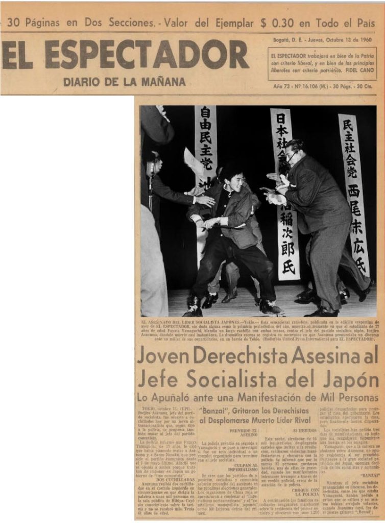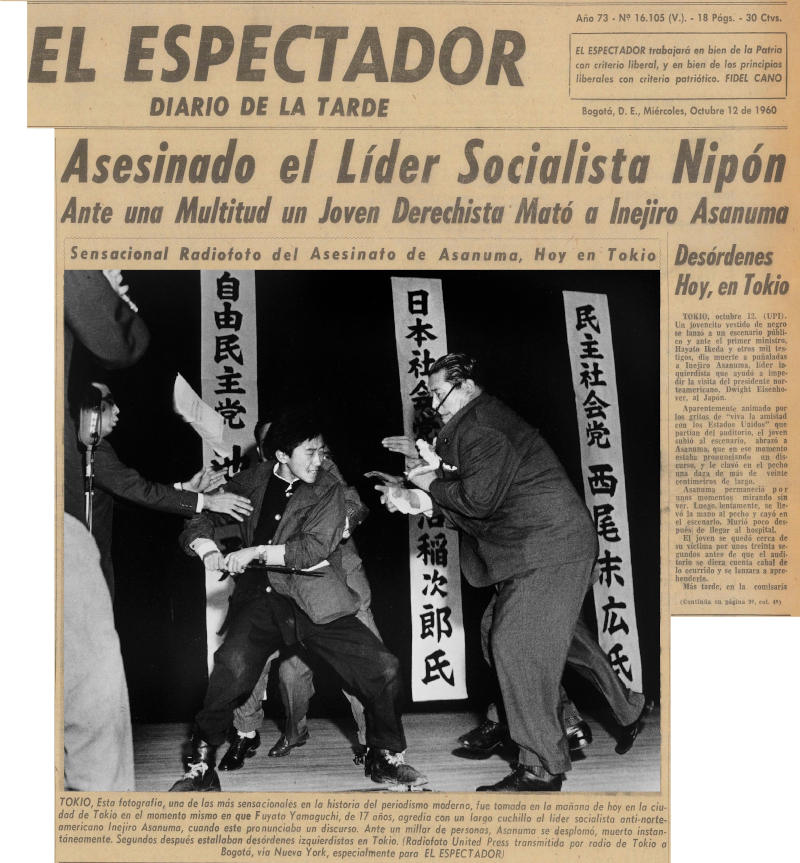 Y después la leyenda: “Esta fotografía, una de las más sensacionales en la historia del periodismo moderno, fue tomada en la mañana de hoy en la ciudad de Tokio en el momento mismo en que Fuyama Yamaguchi, de 17 años, agredía con un largo cuchillo al líder socialista anti-norteamericano Inejiro Asanuma, cuando éste pronunciaba un discurso. Ante un millar de personas, Inejiro se desplomó, muerto instantáneamente. Segundos después estallaban desórdenes izquierdistas en Tokio. (Radiofoto United Press transmitida por radio de Tokio a Bogotá, vía Nueva York, especialmente para EL ESPECTADOR).