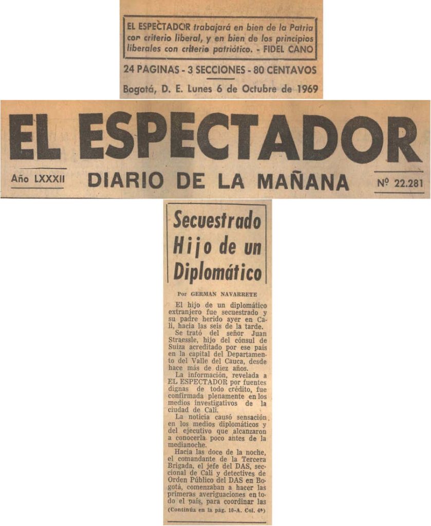 Ante su rotunda negativa tuve que explicarle que se trataba de un doble secuestro de diplomáticos y que el Presidente Carlos Lleras Restrepo le había dado la orden al Jefe del DAS, Gustavo Adolfo Gordillo; a la Policía Nacional y al Ejército, de no permitir que el hecho fuera conocido por ningún periodista, para que no se perjudicara la imagen del país en el exterior, por tratarse de un diplomático europeo y el hijo del Cónsul de Suiza en la ciudad de Cali (Colombia).