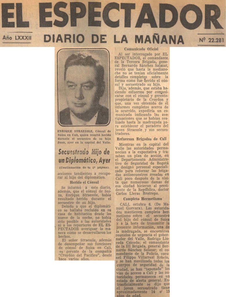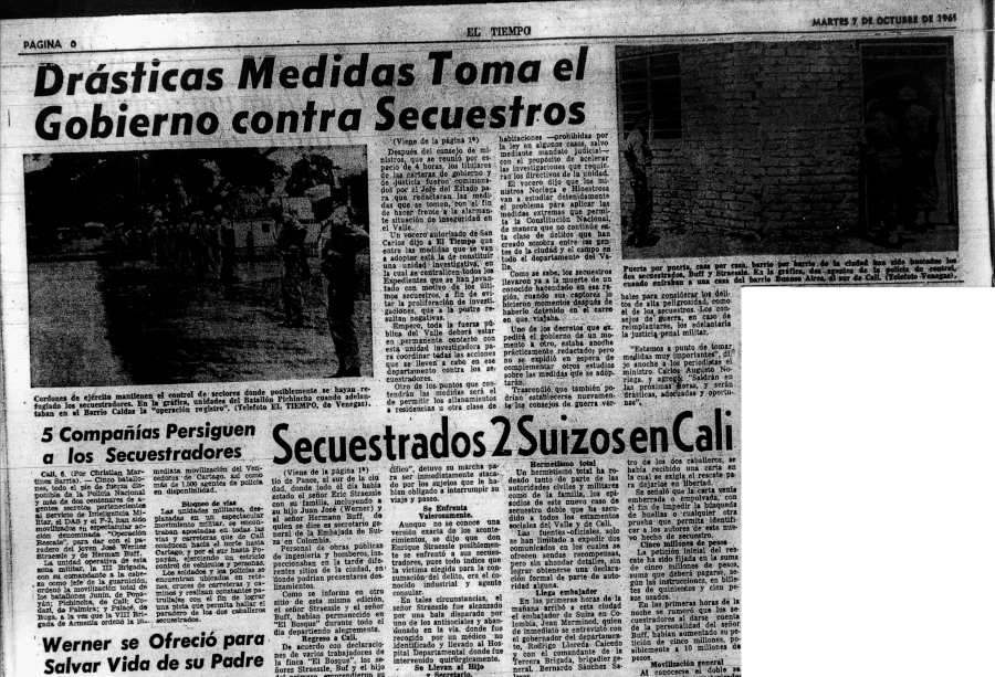 Se trató del doble secuestro del Secretario General de la Embajada de Suiza en Bogotá, Hermann Buff y del joven José Werner Straessle Speck, hijo de Eric Straessle, Cónsul de Suiza en Cali, Departamento del Valle (Colombia), ocurrido en esa ciudad el Domingo 5 de Octubre de 1969. Durante el secuestro, el Cónsul fue herido a bala por uno de los delincuentes, quien en esa época era integrante del naciente “Cartel de Cali”.