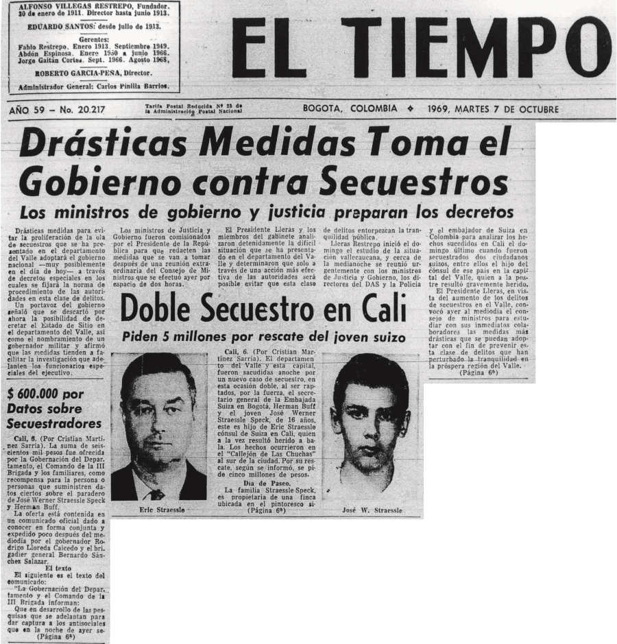 Facsímil de la primera página de EL TIEMPO, del Martes 7 de Octubre de 1969, y continuación de la noticia en la página 6, que le demostró al mundo la gravedad de la situación de orden público que comenzaba a vivir Colombia bajo el “Cartel de Cali”, organización delictiva que tenía azotada a la capital del Valle del Cauca con múltiples secuestros.